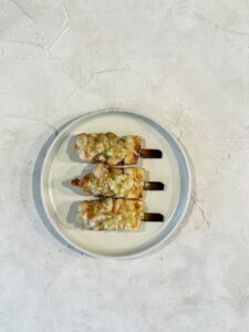 肩肉にミニトマトを刺し、一味でアクセントを付けた赤。