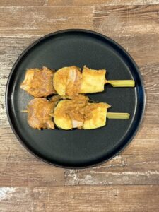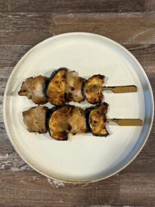 鶏もも肉と季節野菜の茄子を刺し、特製のねぎ味噌だれに絡めました。